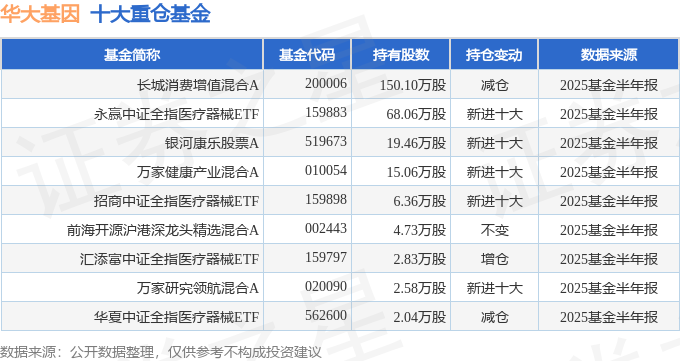 持有华大基因最多的基金为长城消费增值混合A,目前规模为4.21亿元,最新净值1.276(8月22日),较上一交易日上涨1.09%,近一年上涨41.89%。该基金现任基金经理为龙宇飞。